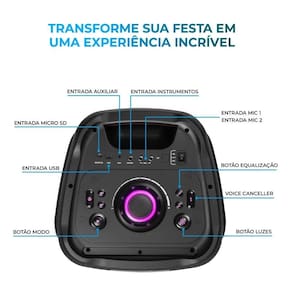 Entradas: 2 entradas para microfones 1 para instrumento Entrada USB, entrada auxiliar e micro SD.