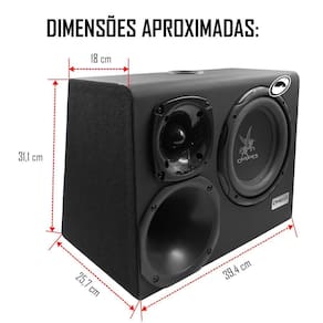 ESPECIFICAÇÕES TÉCNICAS: - Potência de RMS total: 300 Watts; - Resposta de frequência senoidal trio THD 0.01% : De 20 Hz a 20 KHz -3dB ; - Resposta de frequência senoidal SUB THD 0.01% : De 20 Hz a 100Hz -3dB ; - Alto falante 8 bobina simples: 200 Watts; - Drive: 100 Watts; - Tweeter: 100 Watts; - Amplificador digital: 300 Watts; - Caixa: Madeira MDF; - Distorção máxima de saída THD : 01%; - Proteção de temperatura: 80 C; - Consumo máximo: 20A; - Tensão de operação Voltagem de entrada de funcionamento : 10Vcc A 15Vcc; - Tensão de proteção Voltagem de entrada limite : 8.0vcc A 16Vcc; - Sensibilidade de entrada RCA sinal de áudio necessário para obter potência máxima : 0.5vrms A 5Vrms; - Garantia: 1 ano contra defeitos de fábrica.