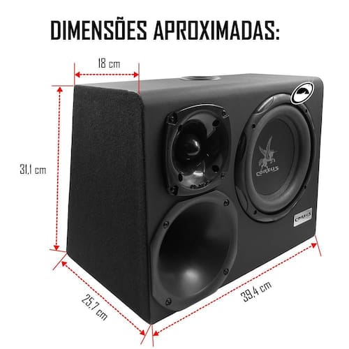 DESCRIÇÃO: A Corzus CXMT 300 8 Polegadas é uma caixa amplificada de dupla função, podendo ser utilizada como caixa trio ou como caixa subgrave, potência total de 300 Watts RMS com amplificador digital de altíssima eficiência e baixo consumo, qualidade de áudio, resposta senoidal de 20Hz a 20KHz modo trio e 20Hz a 110Hz modo Sub, filtro subsônico, proteção eletrônica, entrada de áudio com opção RCA ou via fio, controle de ganho individual para o subwoofer e drive e tweeter, chave seletora modo sub ou modo trio.