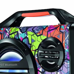 Com 120W RMS e equalizador digital, possui desing moderno na cor preta com speaker aparente, decalques e display digital na lateral do aparelho.