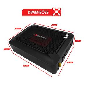 ESPECIFICAÇÕES TÉCNICA: - Modelo: NBF618S; - Saída de potência: 100W RMS; - Potência Máxima: 1000W PMPO; - THD: < 0,4%; - Relação sinal-ruído: >90dB; - Resposta de frequência: 20Hz - 150Hz; - Sensibilidade de entrada / alto nível: 1 - 10 V; - Sensibilidade de entrada, nível baixo: 120mV - 4V; - Filtro passa-baixa: 50Hz - 150Hz; - Reforço de graves: 0 - 12dB; - Filtro Subsônico: 20Hz (fixo); - Classificação do fusível: 20A; - Subwoofer: 6x8 polegadas; - Impedância: 4 Ohms; - Dimensão (C x L x A) mm: 255 x 191 x 60 mm; - Peso: 3,200 Kg.