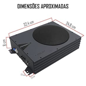 A Caixa Amplificada Slim 8 Polegadas Automotiva Falcon A 250.1 possui entradas em RCA e a fio, oferecendo versatilidade na conexão com outros dispositivos de áudio. Seu perfil compacto em alumínio permite uma instalação fácil e discreta, ocupando pouco espaço no veículo.