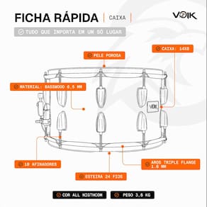 O Kit Caixa de Bateria Voik 14x8 CB14 com Suporte e Baqueta é a escolha ideal para quem busca potência, estabilidade e praticidade. Com casco em madeira Basswood e 8” de profundidade, oferece um som encorpado, com graves marcantes e presença impressionante. O suporte robusto garante firmeza e conforto durante o uso, enquanto a esteira de 24 fios proporciona resposta sensível e definida. Acompanha baqueta Voik de Maple, leve e equilibrada, ideal para tocar com precisão e menos fadiga. Um kit completo, pronto para o palco, ensaio ou estúdio. ? Especificações: Caixa: • Marca: Voik • Modelo: CB14 • Cor: Wood Tone • Pele: Porosa • Casco: Basswood 6,5 mm de espessura • Materiais: Madeira, Metal e PVC • Afinadores: 10 • Aros: Triple Flange 1.6mm • Canoa individual • Esteira: 24 fios • Pele Resposta: Transparente • Timbre: Grave para médio • Circunferência: 14 polegadas • Altura: 8 Polegadas • Peso: 3,868 kg