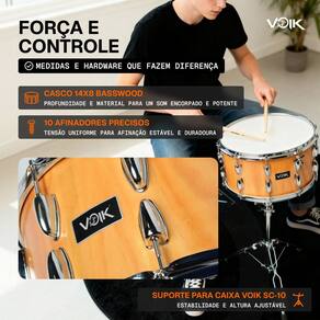 O Kit Caixa de Bateria Voik 14x8 CB14 com Suporte e Baqueta é a escolha ideal para quem busca potência, estabilidade e praticidade. Com casco em madeira Basswood e 8” de profundidade, oferece um som encorpado, com graves marcantes e presença impressionante. O suporte robusto garante firmeza e conforto durante o uso, enquanto a esteira de 24 fios proporciona resposta sensível e definida. Acompanha baqueta Voik de Maple, leve e equilibrada, ideal para tocar com precisão e menos fadiga. Um kit completo, pronto para o palco, ensaio ou estúdio.