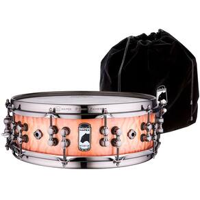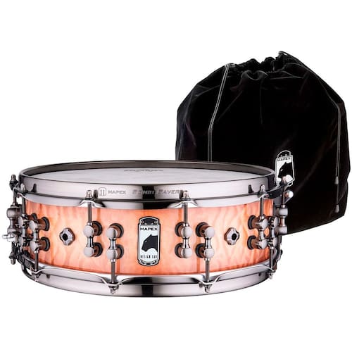 Série: Black Panther – Design LabTamanho: 14? x 4 ?”7 folhas, Maple/Mahogany (Mogno) de 8,55 mm4 orifícios de ventilação (quadrante)Borda superior 45° SONIClear, borda inferior 35° SONIClearAcabamento: SAS 2 Peach Burl BurstCanoa: Master TuneAros Sonic SaverPele ataque: Remo Fiberskyn DiplomatPele resposta: Remo Hazy