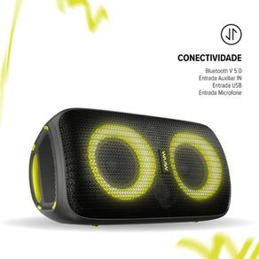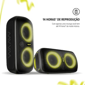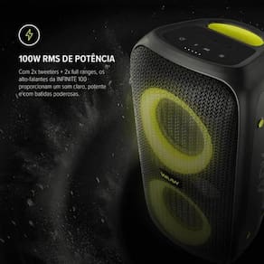 Sinta a batida das suas músicas favoritas toda vez que apertar o play com a Caixa de Som WAAW INFINITE 100. Com uma potência impressionante de 100W RMS, garante que cada som preencha o ambiente de maneira envolvente e imersiva. Equipada com quatro alto-falantes de alta qualidade, incluindo 2 tweeters e 2 full ranges, oferece mais clareza em todas as frequências, desde graves profundos até agudos cristalinos. O Botão Power Bass intensifica os graves, proporcionando batidas mais fortes e perceptíveis, permitindo que você sinta cada nota como se estivesse no coração da música. A tecnologia True Wireless Stereo (TWS) possibilita a conexão de duas caixas WAAW INFINITE 100 via Bluetooth, para um som ainda mais expansivo. Com uma bateria de longa duração com até 14 horas de autonomia, a caixa de som é ideal para festas épicas. Oferece quatro opções de conexão: Bluetooth, cabo auxiliar, porta USB para pendrive e microfone. Com classificação IPX4, é resistente a respingos, sendo perfeita para uso em casa ou ao ar livre. Além disso, a Caixa de Som WAAW INFINITE 100 apresenta um show de luzes em LEDs que pulsam em sincronia com a música, transformando qualquer ambiente em uma pista de dança iluminada e energética.