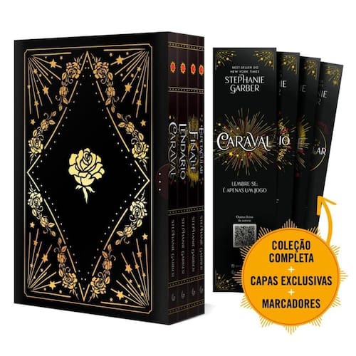 A Caixa Caraval - Edição de colecionador (Série completa) reúne os quatro volumes da aclamada série de fantasia de Stephanie Garber: Caraval, Lendário, Finale e Espetacular. A trama acompanha as irmãs Scarlett e Donatella Dragna em uma jornada fascinante, onde o deslumbrante espetáculo Caraval mistura realidade e ilusão, colocando-as diante de desafios que testam seus laços familiares, sua coragem e seus sentimentos mais profundos. Esta edição especial conta com novas ilustrações de capa e um acabamento exclusivo, tornando a caixa um item indispensável e mágico para fãs e colecionadores da série.