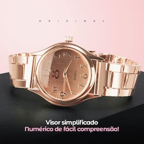 - Relógio Analógico: cor dourada, em aço inoxidável, com tampa personalizada com arte de coração, garantindo um toque único ao seu look.