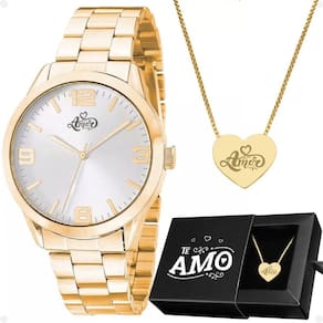 Caixa + Colar Coração Amor Presente Casual Edição Limitada Kit de Presente Orizom Maria - Relógio Feminino, Colar e Pingente - Relógio Feminino Orizom Maria - Cor: Dourado - Material: Aço inoxidável - Tipo de Banho: Banhado - Tampa blindada com arte exclusiva Eu te Amo em formato de coração
