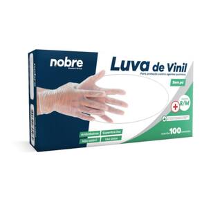 Marca: Nobre Tipo: Luvas de vinil descartáveis sem pó Material: Vinil (PVC) ? livre de látex Tamanho: M (Médio) Cor: Transparente Modelo: Ambidestras, cano curto, superfície lisa Conteúdo da caixa: 100 unidades Registro/CA: 41265 Indicação de uso: Proteção contra agentes químicos em uso doméstico ou profissional Não indicada para: Área da saúde Descartável: Uso único ? proibido reprocessar Validade: 5 anos a partir da fabricação