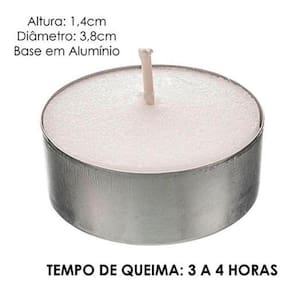 Características: - flutuantes: podem ser utilizadas na água - dimensões das velas: diâmetro: 3,8 cm e altura: 1,3cm Cm unidade - peso: 13 gramas unidade - tempo de queima aproximado: 3 a 4 horas por vela