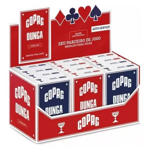 Caixa Com 12 Baralhos Dunga CopagTenha ótimos momentos de diversão e lazer com família e amigos!CARACTERÍSTICAS:Tamanho da carta: Bridge Size 57x89 mm.Quantidade de cartas: 12 caixinhas com 55 cartas cada (52 cartas + 2 curingas + carta garantia).Tipo de embalagem: caixa com 12 unidades (6 un azul + 6 un vermelha).Tipo da carta: cartão couché 300g.Produto de qualidade. Não transparente, atóxico e reciclável.Cartão laminado permitindo um agradável manuseio.ADQUIRA JÁ O SEU!