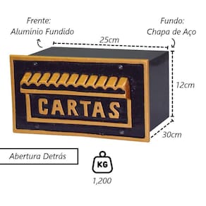 Caixa Correio Para Cartas Inglesa Revista Detras 30x25x12cm A caixa de correio é usada para receber correspondências como cartas, contas e revistas, sendo colocada em frente a residências e empresas para garantir a entrega segura das correspondências. Sua função principal é oferecer um local seguro e conveniente para receber correspondências, protegendo-as do clima e de acesso não autorizado. Existem diversos tipos de caixas de correio, desde as individuais até as maiores para prédios, facilitando a distribuição das correspondências aos destinatários. Indicação de Uso: A caixa de correio é usada em residências, apartamentos, estabelecimentos comerciais, escritórios e instituições públicas para receber correspondências como cartas, pacotes e documentos. Ela serve como um local seguro e conveniente para coletar e armazenar temporariamente essas correspondências até que sejam retiradas pelo destinatário. Especificações Técnicas:Material Frente: Alumínio Fundido.Material Fundo: Chapa de Aço.Importante: Não entra água.Abertura por Detrás.Cor: Dourado. Medidas:Largura: 25cm.Peso: 1,200Kg.Altura: 12cm.Fundo: 30cm. Itens Inclusos:01 Caixa Correio Para Cartas Inglesa Revista Detras 30x25x12cm. Código: 1154MTMProdutoLojaPlast. Marca: Metal Mig