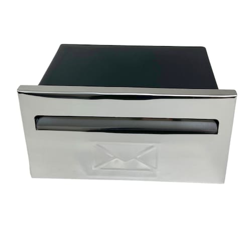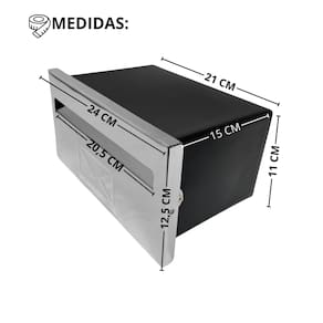 Frente de Inox • Largura da Frente: 24cm • Altura: 12,5cm • Tamanho da Entrada das Cartas: 20,5cm Box de Cartas – Polipropileno (plástico) • Largura do Box: 21cm • Altura do Box: 11cm • Profundidade do Box: 15cm Tamanho da Entrada das Cartas: 20,5cm
