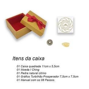 Especificações: 01 Caixa quadrada 11cm x 11cm x 5,5cm 01 Placa turbilhão prosperador 7,5cm x 7,5cm 01 Moeda do I Ching 2,5cm 01 Pedra natural citrino 01 Manual explicativo