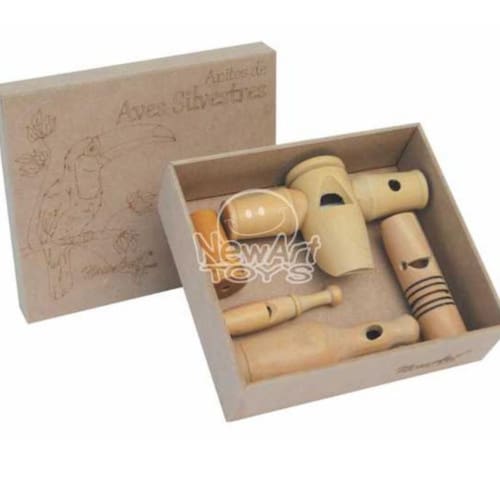Embalagem: Caixa em MDF crú com tampa, pvc encolhível com livreto explicativo + CD para aprender o som do apito.