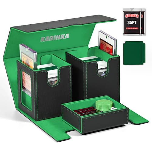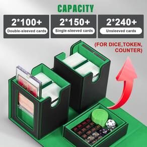 \ Especificações: Material: couro PU Dimensões: 22,4 x 12,5 x 10,9 cm. Cor: preto e verde. Peso: 0,73 kg A embalagem inclui: 1 caixa de armazenamento de cartões colecionáveis 2 porta-cartões magnéticos. 2 divisórias de cartão. Observações: Medição manual, considere pequenos erros no tamanho. A cor pode haver uma pequena diferença devido a diferentes exibições de tela. Se você não estiver satisfeito com sua compra, imediatamente e ouviremos suas preocupações e nossa equipe de atendimento ao cliente encontrará a melhor solução para a situação. - Design inovador: Kabinka caixa de baralho 3 em 1 tem 2 caixas individuais com janela, você pode usar 2 blocos de cartão magnético incluídos para exibir orgulhosamente suas cartas de comandante favoritas; e 1 caixa de dados com capa removível para pequenos acessórios relacionados a jogos - Excelente capacidade: esta caixa de baralho de comandante para mtg funciona com cartas sem mangas, cartas de manga única, cartas de manga dupla, toploaders; cada capa individual cabe facilmente em 100 baralhos de manga dupla; a bandeja de dados projetada para dados, fichas, contadores - Inclusão: a caixa de armazenamento de cartões inclui 2 divisórias que ajudam você a classificar seus cartões de forma mais eficaz; equipado com 2 porta-cartões de 35PT oferece uma proteção extra, prolongando a vida útil do seu cartão e preservando o brilho da cor por muito tempo mantendo - Qualidade premium: magnetismo forte mantém a tampa fechada durante o transporte, ótimo para manter os decks seguros e organizados; o interior é feito com fibra macia para proteger os cartões de arranhões e arranhões; o exterior é feito de couro PU à prova d'água - Boa escolha para colecionadores de cartas: a caixa de armazenamento Kabinka para cartões colecionáveis é a escolha ideal para jogadores, adequada para capas Dragon Shield, cartão de jogo, cartão de beisebol, cartões esportivos etc. Desfrute de jogos de cartas com seus amigos ou familiares com esta caixa de cartão exclusiva