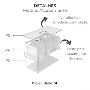 O Organizador de Geladeira Clear Fresh possui capacidade para armazenar até 5 litros de alimentos.