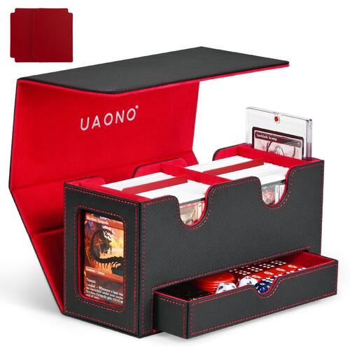 Especificações: Material: couro PU Dimensão: 22,8 x 9,4 x 12 cm / 9 x 3,7 x 4,8 polegadas Cor: preto e vermelho. Peso: 1,45 kg A embalagem inclui: 1 caixa de baralho de cartas. 2 porta-cartões magnéticos. 2 divisórias de cartão. Observações: Medição manual, considere pequenos erros no tamanho. A cor pode haver uma pequena diferença devido a diferentes exibições de tela. Se você não estiver satisfeito com sua compra, imediatamente e ouviremos suas preocupações e nossa equipe de atendimento ao cliente encontrará a solução para a situação. - Exibição de dois comandantes: a caixa de deck duplo é especialmente adaptada para jogadores de EDH de comandante; através da janela de exibição, você pode facilmente olhar para o conteúdo da caixa sem abrir a caixa; dois porta-cartões de 35pt incluídos podem mostrar o cartão claramente - Durável e funcional: a caixa de baralho de cartas é feita de exterior de couro PU que oferece boa proteção e interior de microfibra macia para proteger seus cartões de arranhões; a ampla abertura em forma de U garante fácil acesso aos seus cartões, tornando-o conveniente - Grande capacidade: esta caixa de baralho funciona com cartas sem manga, cartões de manga única, cartões de manga dupla; cada capa pode conter mais de 140 cartas de manga única ou mais de 100 cartas de manga dupla; duas divisórias de cartão incluídas permitem que você classifique cartas diferentes - Magnético forte: a caixa de armazenamento de cartões possui um fecho magnético forte que garante que a caixa permaneça firmemente fechada mesmo que seja tombada, fornece boa proteção para todos os tipos de cartões; o design da bandeja de dados ajuda você a armazenar dados e contadores - Boa escolha para colecionadores de cartas: o estojo de baralho UAONO para cartas colecionáveis é a escolha ideal para jogadores, adequado para armazenar cartas de jogo, cartões esportivos etc. ; Desfrute de jogos de cartas com seus amigos ou familiares; se você tiver alguma dúvida, sinta-se à vontade para entrar em contato conosco
