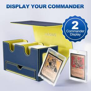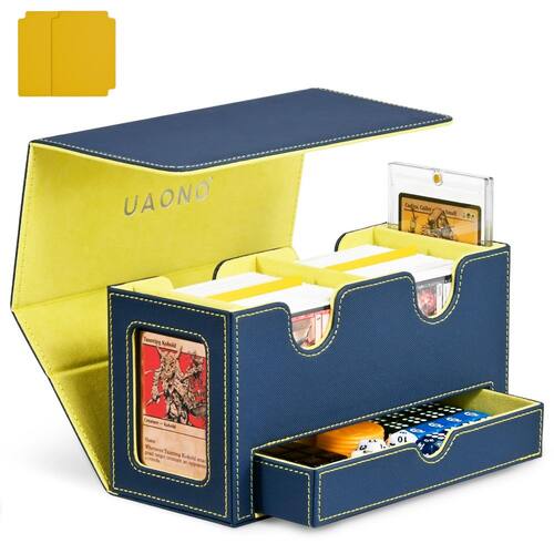 Especificações: Material: couro PU Dimensão: 22,8 x 9,4 x 12 cm / 9 x 3,7 x 4,8 polegadas Cor: azul e amarelo. Peso: 1,45 kg A embalagem inclui: 1 caixa de baralho de cartas. 2 porta-cartões magnéticos. 2 divisórias de cartão. Observações: Medição manual, considere pequenos erros no tamanho. A cor pode haver uma pequena diferença devido a diferentes exibições de tela. Se você não estiver satisfeito com sua compra, imediatamente e ouviremos suas preocupações e nossa equipe de atendimento ao cliente encontrará a solução para a situação. - Exibição de dois comandantes: a caixa de deck duplo é especialmente adaptada para jogadores de EDH de comandante; através da janela de exibição, você pode facilmente olhar para o conteúdo da caixa sem abrir a caixa; dois porta-cartões de 35pt incluídos podem mostrar o cartão claramente - Durável e funcional: a caixa de baralho de cartas é feita de exterior de couro PU que oferece boa proteção e interior de microfibra macia para proteger seus cartões de arranhões; a ampla abertura em forma de U garante fácil acesso aos seus cartões, tornando-o conveniente - Grande capacidade: esta caixa de baralho funciona com cartas sem manga, cartões de manga única, cartões de manga dupla; cada capa pode conter mais de 140 cartas de manga única ou mais de 100 cartas de manga dupla; duas divisórias de cartão incluídas permitem que você classifique cartas diferentes - Magnético forte: a caixa de armazenamento de cartões possui um fecho magnético forte que garante que a caixa permaneça firmemente fechada mesmo que seja tombada, fornece boa proteção para todos os tipos de cartões; o design da bandeja de dados ajuda você a armazenar dados e contadores - Boa escolha para colecionadores de cartas: o estojo de baralho UAONO para cartas colecionáveis é a escolha ideal para jogadores, adequado para armazenar cartas de jogo, cartões esportivos etc. ; Desfrute de jogos de cartas com seus amigos ou familiares; se você tiver alguma dúvida, sinta-se à vontade para entrar em contato conosco