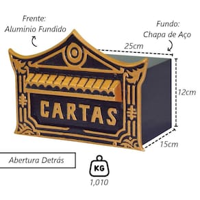 Caixa de Correio Para Cartas Chinesa Ouro Detras 15x25x12cm A caixa de correio é usada para receber correspondências como cartas, contas e revistas, sendo colocada em frente a residências e empresas para garantir a entrega segura das correspondências. Sua função principal é oferecer um local seguro e conveniente para receber correspondências, protegendo-as do clima e de acesso não autorizado. Existem diversos tipos de caixas de correio, desde as individuais até as maiores para prédios, facilitando a distribuição das correspondências aos destinatários. Indicação de Uso: A caixa de correio é usada em residências, apartamentos, estabelecimentos comerciais, escritórios e instituições públicas para receber correspondências como cartas, pacotes e documentos. Ela serve como um local seguro e conveniente para coletar e armazenar temporariamente essas correspondências até que sejam retiradas pelo destinatário. Especificações Técnicas:Material Frente: Alumínio Fundido.Material Fundo: Chapa de Aço.Importante: Não entra água.Abertura por Detrás.Cor: Dourado. Medidas:Largura: 25cm.Peso: 1,010Kg.Altura: 12cm.Fundo: 15cm. Itens Inclusos:01 Caixa de Correio Para Cartas Chinesa Ouro Detras 15x25x12cm. Código: 68MTMProdutoLojaPlast. Marca: Metal Mig