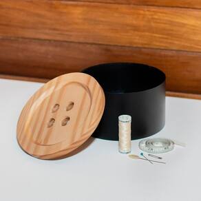 Estilosa, no formato de botão, essa caixa organiza os acessórios de costura e dá personalidade ao ambiente. Tenha agulhas, linhas e tesoura, sempre à mão, para aqueles imprevistos. Produto de aço, sem divisórias internas e com a tampa de madeira com suas variações de tonalidades e veios que possuem uma identidade única. A madeira utilizada é certificada de reflorestamento. Produto fabricado no Brasil. A Coleção Beauty é inspirada nas mulheres apaixonadas por acessórios, que curtem moda e beleza, arrasam no look e são uma inspiração para outras mulheres. Sugestão de presente para quem ama costurar. Os acessórios de costura não acompanham o produto. Conteúdo da Embalagem: 1 caixa. Cor: preto fosco, nogueira. As cores e acabamento do produto podem sofrer variação de acordo com a configuração da sua tela. Altura: 9cm Largura: 15cm Profundidade: 15cm Composição/Material: chapa de aço, pintura epóxi, madeira pinus certificada. Produto fabricado com madeira natural, pode apresentar diversidade de cor, textura e nós próprios da árvore que é extraída. Embalagem: plástico termo encolhível. Dicas de Uso: Produto indicado para áreas internas, evitar ter contato direto com água. Instruções de Conservação: limpar com pano levemente umedecido, não utilizar solventes e abrasivos. Marca: Não Informado