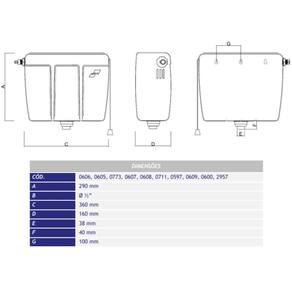 - Marca: Cipla; - Referência: 0711; - Composição: PE (caixa, tampa), PP (puxador, acoplamento); - Cor: Cinza Claro; - Capacidade volumétrica: 9L; - O acionamento mais leve da categoria: Basta um leve toque; - Puxe e solte: Sem a necessidade de segurar a cordinha durante o acionamento; - Mecanismos testados individualmente: Qualidade garantida; - Menor desgaste e maior vida útil; - Maior vazão para limpeza perfeita; - Entrada de alimentação: 1/2'' | Saída: 40 mm; - Norma de Referência: NBR 15491.
