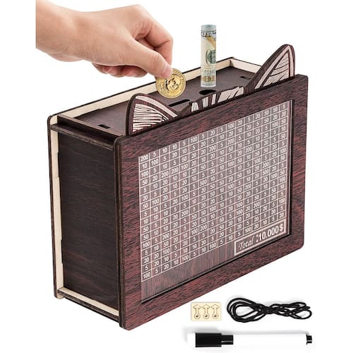 Caixa de economia de dinheiro atualizada, 10.000 cofrinhos de madeira para crianças, caixa de moedas, presentes, brinquedos para crianças de 8 a 13 anos, caixa de economia de dinheiro Kakaibo reutilizável para crianças, presentes de aniversário de Natal para meninos, meninas e adultos, desafio