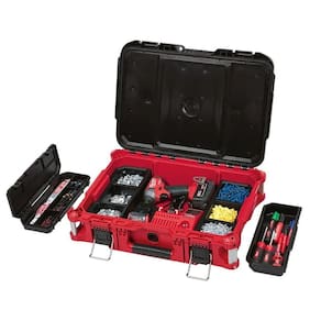 A Caixa De Ferramentas Milwaukee conta com organizadores internos removíveis que facilitam o armazenamento e a organização de ferramentas e acessórios. Além disso, possui certificação de proteção IP65, o que assegura resistência contra água e poeira, preservando o conteúdo interno em ambientes rigorosos.