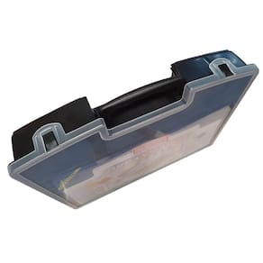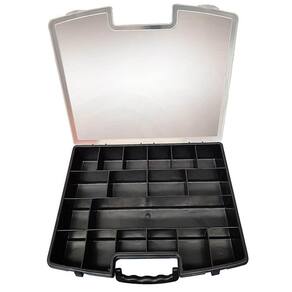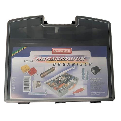 É uma caixa de polipropileno em formato de maleta com alça, com tampa transparente, sendo 18 divisórias.