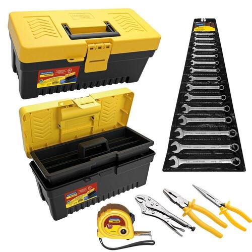 Caixa de Ferramentas Plastica + Jogo de Chaves Combinadas 6 a 32mm, Trena e AlicatesA caixa de ferramentas plástica, acompanhada pelo jogo de chaves combinadas de 6 a 22mm, trena e alicates, é o conjunto perfeito para todas as suas necessidades de reparo e manutenção. Com a caixa de ferramentas durável e espaçosa, você pode organizar e transportar suas ferramentas com facilidade. O jogo de chaves combinadas oferece uma ampla variedade de tamanhos para apertar e soltar parafusos e porcas. Além disso, a trena é útil para medir com precisão, enquanto os alicates fornecem a versatilidade necessária para lidar com diferentes tipos de trabalhos. Com essa combinação de ferramentas, você estará preparado para enfrentar qualquer projeto de reparo ou manutenção com confiança e eficiência.Especificações Técnicas:Alicate Bico Meia Cana 8 Isolado 1000V Tramontina • Acabamento Fosfatizado.• Cabeça e Articulação Lixadas.• Têmpera Especial no Gume de Corte e Mandíbulas.• Produto em Conformidade com a NBR 9699 e NR10. Isolação 1.000 V Para Uso em Locais com Baixas Tensões de até 1.000V em Corrente Alternada.• Articulação Suave Para Facilitar o Uso.• Os Cabos Possuem um Formato Ergonômico Para Aumentar o Conforto.• As Ferramentas São Produzidas e Testadas Conforme Normas EspecíficasAlicate de Pressão Tramontina• Material: Aço Especial• 10 Polegadas• Corpo Formado Por Chapas Conformadas• Acabamento Cromado• Abertura Regulável• Possui Alavanca Para Destravar• Mordente Curvo• Formato Ergonômico Para Maior ConfortoAlicate Universal 8 Isolado 1000 V Tramontina• Acabamento Fosfatizado.• Cabeça e Articulação Lixadas.• Têmpera Especial no Gume de Corte e Mandíbulas.• Produto em Conformidade Com a NBR 9699 e NR10. Isolação 1.000V Para Uso em Locais com Baixas Tensões de Até 1.000 V em Corrente Alternada.• Articulação Suave Para Facilitar o Uso.• Os Cabos Possuem um Formato Ergonômico Para Aumentar o Conforto.• As Ferramentas São Produzidas e Testadas Conforme Normas Específicas.Caixa Plástica para Ferramentas 13 Bandeja Removível• Corpo Injetado em Plástico de Alta Resistência.• Trava Plástica.• Pino em Aço Para Reforçar a Articulação da Tampa.• Possibilita o Uso de Cadeado.• Capacidade de Carga Interna: 8 Kg.Jogo Chave Combinada 6 A 32 Aço Especial 17 Peças Tramontina• Corpo Forjado em Aço Especial e Temperado.• Acabamento Cromado.• Abertura das Bocas Calibradas.• Pescoço Longo.• O Teste de Dureza é Realizado em Vários Pontos Para Assegurar a Resistência ao Desgaste da Chave Durante o Uso Ininterrupto.• As Aberturas das Bocas das Chaves de Aperto são Verificadas com Gabaritos Calibrados, o que Garante seu Perfeito Acoplamento nos Parafusos.• Alguns Tipos de Chaves de Aperto são Fornecidos em Bitolas Métricas e em Polegadas, Para o Uso nos Diversos Fixadores Disponíveis.• As Ferramentas são Produzidas e Testadas Conforme Normas Específicas.Trena Tramontina com Fita de Aço e Corpo em ABS Freio Duplo 5 m• Fita em Aço Temperado.• Graduação em Milímetros e Polegadas.• Corpo em Plástico ABS.• Trava Para Fixar a Fita Métrica.• Cinta Para Facilitar o Transporte.• Freio Duplo.• Fita com 3 Rebites Para Maior Segurança.• Todas as Ferramentas de Medição são Inspecionadas e Verificadas Para Manter um Alto Nível de Precisão.• As Ferramentas São Submetidas a Testes de Aplicação Prática Para Garantir sua Resistência em Uso Intenso.• As Ferramentas são Produzidas e Testadas Conforme Normas Específicas.Conteúdo da Embalagem:• 01 Caixa Plástica para Ferramentas 13 Bandeja Removível• 01 Alicate de Pressão Tramontina• 01 Alicate Bico Meia Cana 8 Isolado 1000V Tramontina• 01 Alicate Universal 8 Isolado 1000 V Tramontina• 01 Trena Tramontina com Fita de Aço e Corpo em ABS Freio Duplo 5 m• 01 Jogo Chave Combinada 6 A 32 Aço Especial 17 Peças Tramontina• Manual e Certificado de GarantiaImportante:• Garantia de 273 Dias.• Valor Kit.