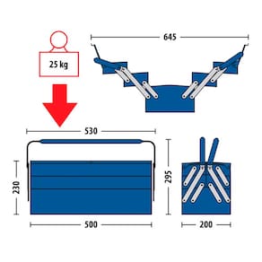 Em chapa reforçada de aço especial com espessura: 0,6 mm. Estrutura e alça com acabamento em pintura na cor azul padrão Gedore, articulação com acabamento niquelado e cromado. Caixa resistente e soldada, com 2 alças para maior estabilidade. A caixa 1335 possui furo com diâmetro de 8,3 mm para utilização de cadeado (não incluso). Ideal para armazenar as ferramentas utilizadas na manutenção de veículos, máquinas e outras aplicações. Fornecida sem ferramentas.