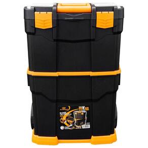 Esta caixa de ferramentas rolante tem um interior espaçoso para segurar ferramentas como martelo, fita métrica, chaves de fenda, chaves de fenda, chaves, etc.