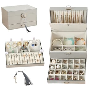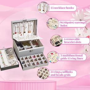 A caixa de joias preta de 5 camadas tem 15 ganchos de colar para armazenamento de colares e correntes. - Organizador de joias grande para mulheres: esta caixa de armazenamento de joias tem 13 linhas de anel, 6 grades de pulseira, 15 ganchos de colar, 98 furos. Quando você tirar a 1ª bandeja de joias, você encontrará 6 grades de pulseira grandes, que podem colocar as joias que você deseja colocar. Com uma variedade de designs e compartimentos, esta caixa de joias pode armazenar todas as suas joias, de peças grandes a brincos pequenos, com um local para guardá-las. - Caixa organizadora de brincos: a primeira camada na tampa da caixa de joias tem 15 ganchos de colar. A segunda camada tem 96 furos para brincos. A terceira camada tem 3 grades de pulseira, 3 brincos e tábuas penduradas para colar, 13 linhas de anéis. A 4ª camada tem 6 braceletes. A camada inferior era uma grande gaveta para acessórios de cabelo, óculos de sol e colares. - Organizador de joias de grande capacidade: esta caixa organizadora de joias de 5 camadas tem grande espaço de armazenamento para armazenar todos os tipos de joias, como colar, pulseira, brincos, anéis, broches, grampos de cabelo e assim por diante. - Material premium: o exterior da caixa de joias é feito de couro PU de alta qualidade, resistente ao desgaste, à prova d'água e fácil de limpar. O forro do organizador de joias é feito de veludo macio, que pode evitar arranhões e é mais durável. - Presente perfeito: esta é uma caixa de joias muito bonita, o design requintado é muito adequado para mulheres e meninas armazenarem e organizarem suas joias. Também é a escolha de presente perfeita para o Dia dos Namorados, Dia das Mães, Natal, aniversários, casamentos e outros feriados.