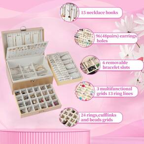 A caixa de joias preta de 5 camadas tem 15 ganchos de colar para armazenamento de colares e correntes. - Organizador de joias grande para mulheres: esta caixa de armazenamento de joias tem 13 linhas de anel, 6 grades de pulseira, 15 ganchos de colar, 98 furos. Quando você tirar a 1ª bandeja de joias, você encontrará 6 grades de pulseira grandes, que podem colocar as joias que você deseja colocar. Com uma variedade de designs e compartimentos, esta caixa de joias pode armazenar todas as suas joias, de peças grandes a brincos pequenos, com um local para guardá-las. - Caixa organizadora de brincos: a primeira camada na tampa da caixa de joias tem 15 ganchos de colar. A segunda camada tem 96 furos para brincos. A terceira camada tem 3 grades de pulseira, 3 brincos e tábuas penduradas para colar, 13 linhas de anéis. A 4ª camada tem 6 braceletes. A camada inferior era uma grande gaveta para acessórios de cabelo, óculos de sol e colares. - Organizador de joias de grande capacidade: esta caixa organizadora de joias de 5 camadas tem grande espaço de armazenamento para armazenar todos os tipos de joias, como colar, pulseira, brincos, anéis, broches, grampos de cabelo e assim por diante. - Material premium: o exterior da caixa de joias é feito de couro PU de alta qualidade, resistente ao desgaste, à prova d'água e fácil de limpar. O forro do organizador de joias é feito de veludo macio, que pode evitar arranhões e é mais durável. - Presente perfeito: esta é uma caixa de joias muito bonita, o design requintado é muito adequado para mulheres e meninas armazenarem e organizarem suas joias. Também é a escolha de presente perfeita para o Dia dos Namorados, Dia das Mães, Natal, aniversários, casamentos e outros feriados.
