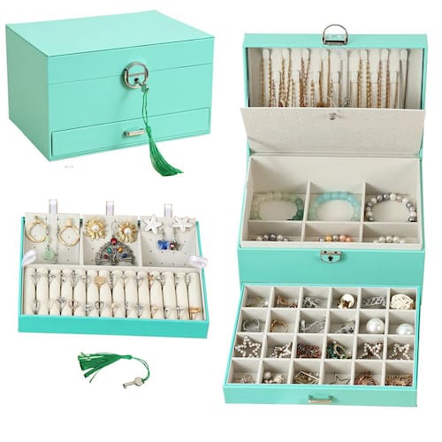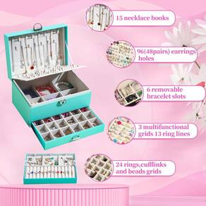 A caixa de joias preta de 5 camadas tem 15 ganchos de colar para armazenamento de colares e correntes. - Organizador de joias grande para mulheres: esta caixa de armazenamento de joias tem 13 linhas de anel, 6 grades de pulseira, 15 ganchos de colar, 98 furos. Quando você tirar a 1ª bandeja de joias, você encontrará 6 grades de pulseira grandes, que podem colocar as joias que você deseja colocar. Com uma variedade de designs e compartimentos, esta caixa de joias pode armazenar todas as suas joias, de peças grandes a brincos pequenos, com um local para guardá-las. - Caixa organizadora de brincos: a primeira camada na tampa da caixa de joias tem 15 ganchos de colar. A segunda camada tem 96 furos para brincos. A terceira camada tem 3 grades de pulseira, 3 brincos e tábuas penduradas para colar, 13 linhas de anéis. A 4ª camada tem 6 braceletes. A camada inferior era uma grande gaveta para acessórios de cabelo, óculos de sol e colares. - Organizador de joias de grande capacidade: esta caixa organizadora de joias de 5 camadas tem grande espaço de armazenamento para armazenar todos os tipos de joias, como colar, pulseira, brincos, anéis, broches, grampos de cabelo e assim por diante. - Material premium: o exterior da caixa de joias é feito de couro PU de alta qualidade, resistente ao desgaste, à prova d'água e fácil de limpar. O forro do organizador de joias é feito de veludo macio, que pode evitar arranhões e é mais durável. - Presente perfeito: esta é uma caixa de joias muito bonita, o design requintado é muito adequado para mulheres e meninas armazenarem e organizarem suas joias. Também é a escolha de presente perfeita para o Dia dos Namorados, Dia das Mães, Natal, aniversários, casamentos e outros feriados.