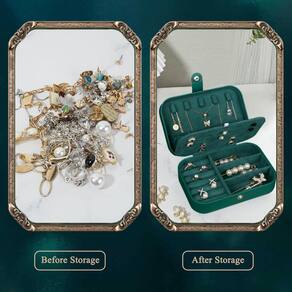 Caixa de joias de viagem - Caixa multifuncional e espaço personalizado: o layout dentro da caixa organizadora de joias é de camada dupla, a parte inferior tem 7 rolos de anel e 3 compartimentos removíveis para colares, anéis, pulseiras, brincos, pingentes, mova as divisórias para criar o espaçamento personalizado para acomodar diferentes tamanhos de joias. A parte superior da tampa inclui 5 ganchos e bolso elástico inferior para manter colares, pulseiras perfeitamente no lugar e sem bagunça - Tamanho perfeito e portabilidade: a mini caixa de joias tem um exterior resistente mas muito fofo, o tamanho é 16 x 11 x 5,6 cm, grande o suficiente para armazenar joias, mas pequena o suficiente para economizar espaço, apenas 220 g, leve, ótima para colocar em uma mala ou colocar em uma gaveta, super conveniente ao viajar - Qualidade premium: o exterior do organizador de joias é feito de couro PU para robustez e resistência ao desgaste, enquanto o material interior é feito de forro de veludo macio para evitar que suas joias arranhem e batidas. Os fechos se prendem bem e são fáceis de abrir e fechar novamente - EXCELENTE ORGANIZADOR DE JOIAS: Este organizador de viagem de joias tem incrível capacidade de armazenamento, seu tamanho compacto cabe em qualquer lugar, especialmente ao viajar, não apenas tudo dentro de casa é seguro, mas também mantém as joias em ordem e protegidas de serem emaranhadas ou danificadas durante a viagem - O presente perfeito para o dia das mães: o estojo de joias de viagem é especial para meninas e mulheres, apresenta um design elegante e compacto, bem feito, durável, resistente, perfeito presente para mãe, esposa, namorada, filha, amigas e até mesmo festa nupcial em casamento, Natal, aniversário, dia das mães, dia dos namorados