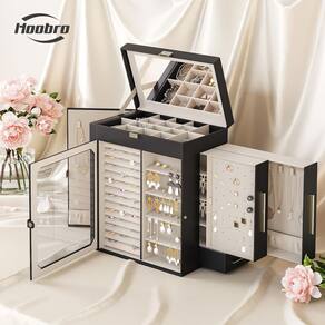 Especificações: - Cor: preto, ouro claro - Material: PU, veludo, vidro, metal, MDF - Tamanho do produto: 10,4 “L x 6,5" L x 12,8" H - Peso do produto: 6,8 libras Conteúdo da embalagem: - 1 x caixa de joias HOOBRO Nota: - Mantenha o produto seco e arrumado.