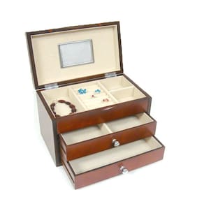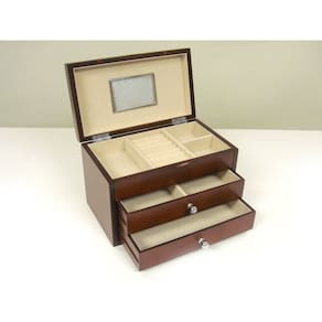 de caixa de joias tem 2 gavetas e bandeja de cima que tem mais de armazenamento para acessórios pequenos.