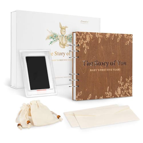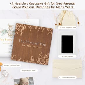 Toque personalizado com lembranças e cartas: as 2 sacolas de armazenamento de algodão permitem que você guarde os pelos fetais, dentes de leite ou outras lembranças pequenas do bebê. Os 2 envelopes especiais espessados permitem que você escreva cartas sinceras para um bebê recém-nascido e faça dele uma cápsula do tempo única. Esses pequenos detalhes tornam cada memória mais calorosa e autêntica.