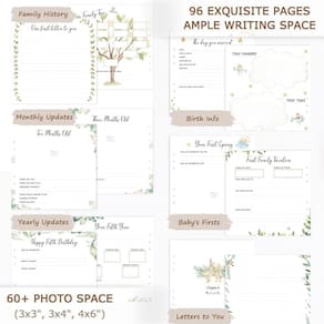 O crescimento de cada bebê é uma história de vida cheia de milagres. O livro de memórias de madeira Creawoo permite que você registre cada momento do processo de crescimento do bebê. Não é apenas um livro de lembranças de bebês, mas um monumento ao amor entre você e seu bebê. Desde o dia da gravidez até a primeira risada do bebê, a primeira sessão, a primeira caminhada e o primeiro aniversário, cada momento maravilhoso pode ser registrado permanentemente neste livro de memórias elegante e de qualidade. Páginas bem projetadas e detalhadas permitem que você registre os principais marcos do seu bebê. A capa desta lembrança de livro para bebês é feita de uma placa de madeira especial com delicados entalhes a céu aberto. O toque durável e confortável vem com um toque vintage e sofisticado. Cada página interna é grossa o suficiente para resistir ao rasgo e ao desbotamento e proteger suas preciosas memórias de bebê para sempre. Exclusivo com design de bobina de folha solta para você remover ou substituir páginas facilmente. O livro Baby Milestone vem com espaço suficiente para escrever e páginas fotográficas extras para incentivá-lo a documentar e exibir o desenvolvimento do seu bebê de maneiras únicas. Quer se trate de reuniões familiares, vida diária ou viagens de férias, cada momento interessante pode ser preservado para formar uma herança familiar única. Para atender a todos os tipos de famílias, anexamos páginas extras com envelopes separados para o livro infantil de gênero neutro, incluindo LGBTQ, pais solteiros e famílias adotivas, independentemente de raça e religião. Se necessário, você pode substituir as páginas “" Sobre mamãe/papai "” por meio de uma bobina de folha solta. O bloco de tinta para bebês garante que você capture as impressões das mãos ou pegadas do bebê e as salve por muitos anos. Os sacos de armazenamento de algodão permitem que você guarde os pelos fetais, dentes de leite ou outras pequenas lembranças do bebê. Os envelopes especiais espessos permitem que você escreva cartas sinceras para um bebê recém-nascido e faça dele uma cápsula do tempo única. Escolher o primeiro conjunto de livros deste bebê para meninos e meninas recém-nascidos é como dar a eles um presente futuro.