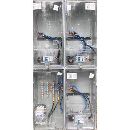 As caixas para medição montadas são utilizadas para instalação conforme padrão de energia elétrica. Fabricada em policarbonato, tem como função básica acomodar o disjuntor, cabos e medidores, por isto é conhecida popularmente como caixa de relógio de luz. Elas seguem o padrão de acordo com a norma das concessionárias de energia. São instaladas no muro lateral no interior da residência, via de regra nas áreas de garagem e/ou jardim, em local visível para fácil leitura, sendo o acesso frontal ao disjuntor.