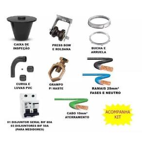 Especificações técnicas para caixa de luz TAF 01 Caixa para Disjuntor Geral 80A e Barramento de distribuição 03 Caixas para medidor 520x260x170mm; 03 Disjuntores bipolares 50A para cada medidor; Ramal de Entrada Cabo flexível 750V 25mm 2 lances de 6 metros Fase Pretos, 1 lance 6 metros Neutro Azul e 1 lance 1,5 metros Terra Verde e terminais tipos ilhós e argola 25mm; Caixa de Inspeção Cônica Preta Armação Press Bow e Roldana Bucha e Arruela de Alumínio Curva e Luvas PVC 1.1/4 Grampo para Haste de Aterramento