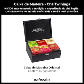 Com esta caixa você leva 300 anos de tradição na arte de fazer chá, e uma coleção preciosa de 6 deliciosas infusões de frutas e ervas, tão perfeitamente combinadas que você sente o aroma e o sabor de cada ingrediente.Sobre o Chá TwiningsA marca de chá favorita no mundo.Chá oficial da Família Real Britânica. Produto importado, fabricado na Europa. Muita tradição e sabor. Mais de 300 anos de história. Conteúdo 1 caixa de madeira com 6 divisões com capacidade para 60 saquinhos de chá.6 caixinhas com 10 saquinhos de chá. Totalizando 60 saquinhos de chá. Sabores Inclusos na Caixa1 CamomilaColhemos nossa camomila durante os meses quentes do ano, selecionando a parte mais doce da flor. Esta delicada infusão floral é conhecida por suas propriedades relaxantes. Feita somente com ingredientes naturais, não contém cafeína. Ingredientes: Capítulos florais de camomila. CONTÉM GLÚTEN.1 HortelãFeito a partir das melhores folhas da hortelã, você consegue sentir a refrescância deste blend a cada gole. Produzido somente com ingredientes naturais, não contém cafeína. Ingredientes: Folhas e ramos de hortelã. NÃO CONTÉM GLÚTEN.1 Limão e Framboesa Infusão exclusiva da Twinings, combinamos aqui dois sabores cítricos para uma experiência super refrescante: limão e framboesa. Seu aroma é incomparável e ela é perfeita para ser consumida quente na xícara ou fria com muito gelo durante o verão.Ingredientes: Frutos de rosa-silvestre, folhas de laranja, frutos de maçã, flores de hibisco, frutos de framboesa, cascas de limão e aromatizante. NÃO CONTÉM GLÚTEN.1 Morango e MangaNesta infusão única da Twinings, o aroma marcante do morango mistura-se ao sabor suave e adocidado da manga, criando um sabor surpreendente ao paladar e perfeito para o clima brasileiro. Ingredientes: Flores de hibisco, folhas e cascas de laranja, frutos de rosa-silvestre, frutos de maçã, frutos de morango, frutos de manga e aromatizante. NÃO CONTÉM GLÚTEN.1 English BreakfastUm dos chás pretos mais tradicionais, ele é feito a partir da combinação de folhas de chás de diversas origens, colhidas nas melhores plantações do mundo. De sabor encorpado, este chá é ideal para começar o dia com mais disposição. Ingredientes: Folhas de chá preto. NÃO CONTÉM GLÚTEN.1 Chá Preto Frutas VermelhasO Chá Preto Frutas Vermelhas tem um aroma delicado resultante do perfeito equilíbrio entre a intensidade do chá preto e o sabor fresco e marcante das frutas vermelhas. Ingredientes: Folhas de chá preto, frutos de cereja, frutos de framboesa, frutos de groselha, frutos de morango e aromatizantes. NÃO CONTÉM GLÚTEN.Observações Peso da Caixa: 530 gramas.Dimensões da Caixa: Largura 23,5cm; Altura 9,5 cm; Profundidade 15,5 cm.Validade dos Chás: 24-36 Meses