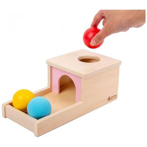 A Caixa de Permanência de Objetos Montessori promove a exploração sensorial através do uso de diversos materiais. Bola de madeira amarela, bola de plástico vermelha e bola macia de EVA azul. As diferentes texturas das bolas de madeira, plástico e macio proporcionam ção tátil, permitindo que os bebês sintam a textura, o peso e a temperatura de bolas diferentes, envolvendo assim o sentido do toque e desenvolvendo ainda mais a percepção sensorial.
