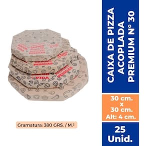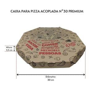 Caixa De Pizza Oitavada Acoplada Premium N° 30 Com 25 Unidades Dimensões: 30cmx30cmx3,5cm. A Caixa para Pizza Oitavada com Tampa Acoplada consegue manter a temperatura ideal dos alimentos até o destino, oferece mais segurança no transporte, pois a tampa e o fundo são presos por um dos lados. Marca: TAMAROZZI