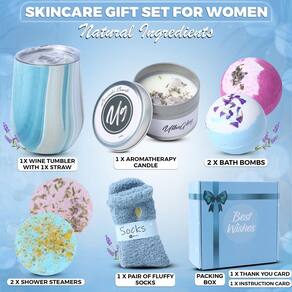 - ?O que está incluído? Esta cesta de presente de spa inclui: um copo de vinho de aço inoxidável, canudo, limpador de palha, 2 bombas de banho, 2 vaporizadores de chuveiro, meias ultramacias, uma vela de aromaterapia e um cartão de agradecimento — tudo embalado em uma elegante caixa de presente azul claro. Perfeito para mimá-la em qualquer dia especial