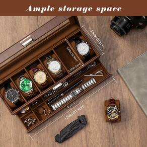 ProCase Caixa de relógio para homens, caixa de exibição de relógio com 6 compartimentos com gaveta, caixa de relógio masculino com tampa de vidro, joias de 2 camadas e organizador de relógio para - Tamanho total: 32,5 x 11 x 11 cm P x 11 cm A (32,5 x 11 x 11 cm); com 6 compartimentos e pode caber em diferentes tipos de relógios com um tamanho de mostrador de até 50 mm - 2 camadas: a camada superior pode conter 6 relógios, e a gaveta inferior oferece armazenamento adicional para pulseiras de relógio, abotoaduras, pulseiras, anéis, canetas, colares e outras joias, mantê-los em um só lugar e protegê-los contra umidade, agitação e fricção ou falta - Tampa de vidro transparente: coleção de relógios com janela de vidro resistente, evita poeira e arranhões, encontre seu favorito rapidamente para economizar tempo; também carregue seus relógios movidos a energia solar - Materiais de qualidade: exterior de couro PU e forro macio para um visual elegante para proteger o relógio de arranhões; travesseiros macios e de suporte se encaixam na maioria dos tamanhos e estilos de relógios, mantendo-os em boa forma - Presentes para pessoas amadas: para sua família e amigos no Natal, pai, dia dos namorados, aniversário, formatura, etc. Ou por que não cuidar de si mesmo? Você merece