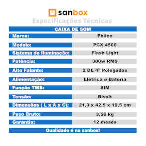 Totalmente versátil! Essa Caixa possui tecnologias como Função Philco connection (conectividade entre duas PCX4500) TWS que permite conectar duas caixas sem a necessidade de fios, com isso, você dobra a potência e criar uma imersão maior ao escutar suas músicas favoritas.