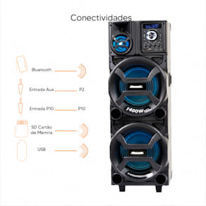 Recheada de funcionalidades! Essa caixa de som oferece conexões e tecnologias como Bluetooth, mas você também pode reproduzir músicas através de entradas físicas, como pen drive (USB), cartão de memória ou até mesmo pela entrada auxiliar P2. Além disso, essa caixa de som também tem duas entradas P10 para a conexão de microfone e instrumentos musicais.